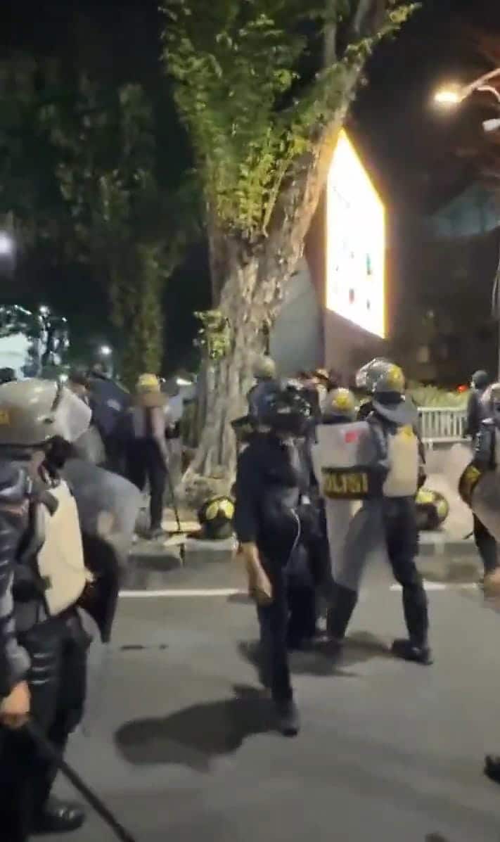 Hingga pukul 18.30 WIB, aparat kepolisian terus mendorong mundur massa aksi dari Jalan Gubernur Suryo hingga ke arah Jalan Pemuda.