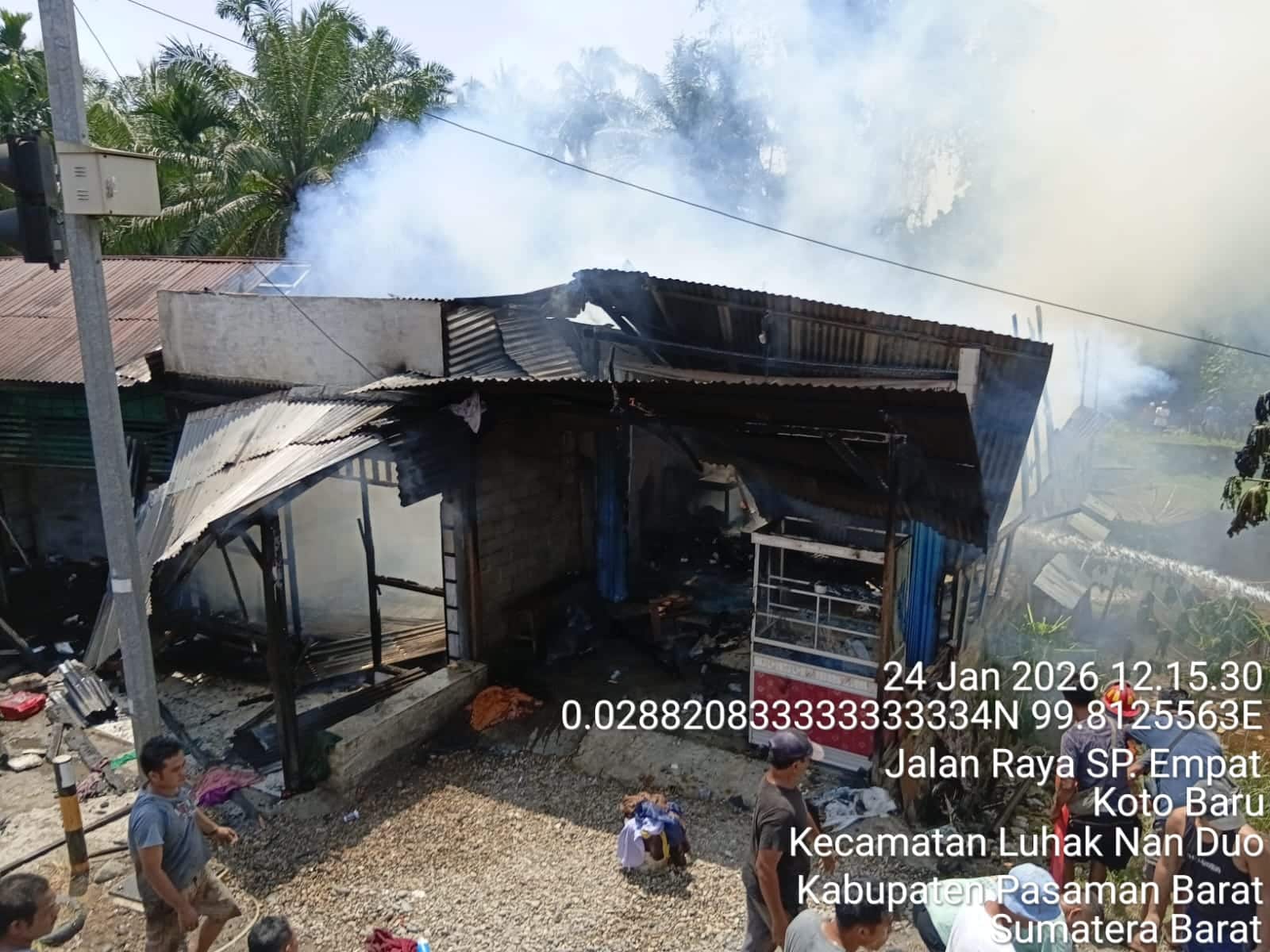 LUHAK NAN DUO | Mikanews.Id : Kepulan asap hitam membumbung tinggi di kawasan Simpang Tiga, Kecamatan Luhak Nan Duo, Kabupaten Pasaman Barat, Sabtu siang (24/1/2026). Kobaran api yang muncul sekitar pukul 11.40 WIB dengan cepat melahap dua unit ruko dan memicu kepanikan warga sekitar.