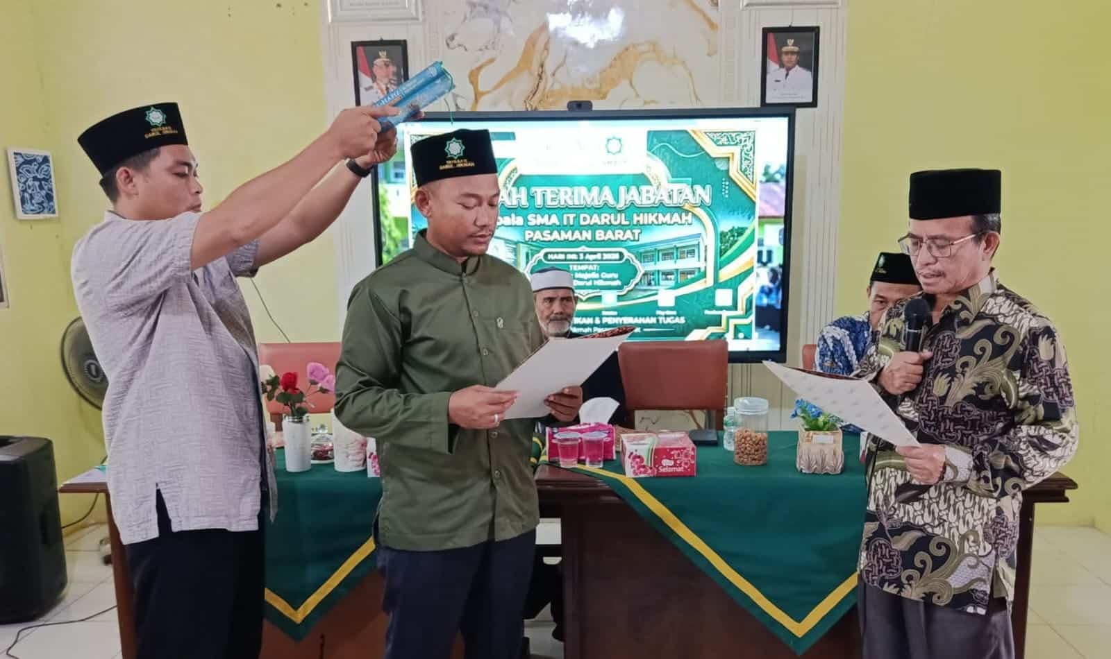 Pasaman Barat | Mikanews.id – Ketua Yayasan Darul Hikmah Pasaman Barat, Elfizon Amir, Jumat (3/4) melantik sekaligus mengukuhkan kepala SMP Islam Terpadu (IT) dan SMA IT Darul Hikmah Pasaman Barat di ruang majelis guru SMA itu, Batang Umpai Kecamatan Pasaman.