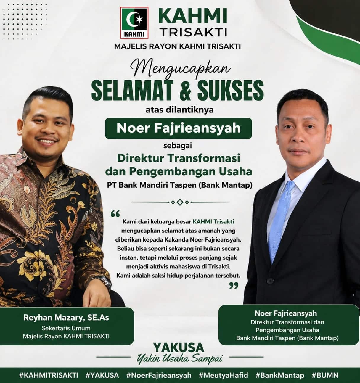 Jakarta | Mikanews.id — Keluarga Besar MR KAHMI Trisakti menyampaikan ucapan selamat atas dilantiknya Noer Fajrieansyah sebagai Direktur Transformasi dan Pengembangan Usaha di PT Bank Mandiri Taspen.