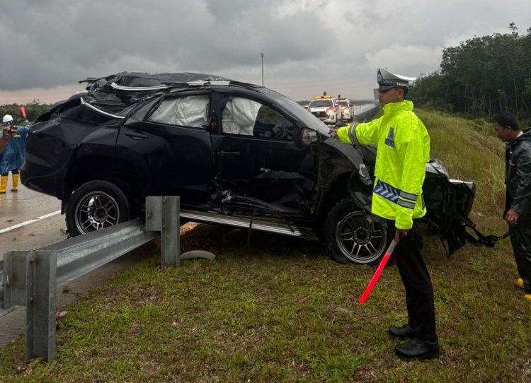 “Mobil Fortuner ini diduga melaju dengan kecepatan tinggi dan kurang berhati-hati di jalan yang licin akibat hujan. Saat melewati jalur lurus, mobil tiba-tiba kehilangan kendali (slip) hingga naik ke atas pembatas jalan,” kata Kanit Tol Pekanbaru–Bangkinang AKP Ramelan.