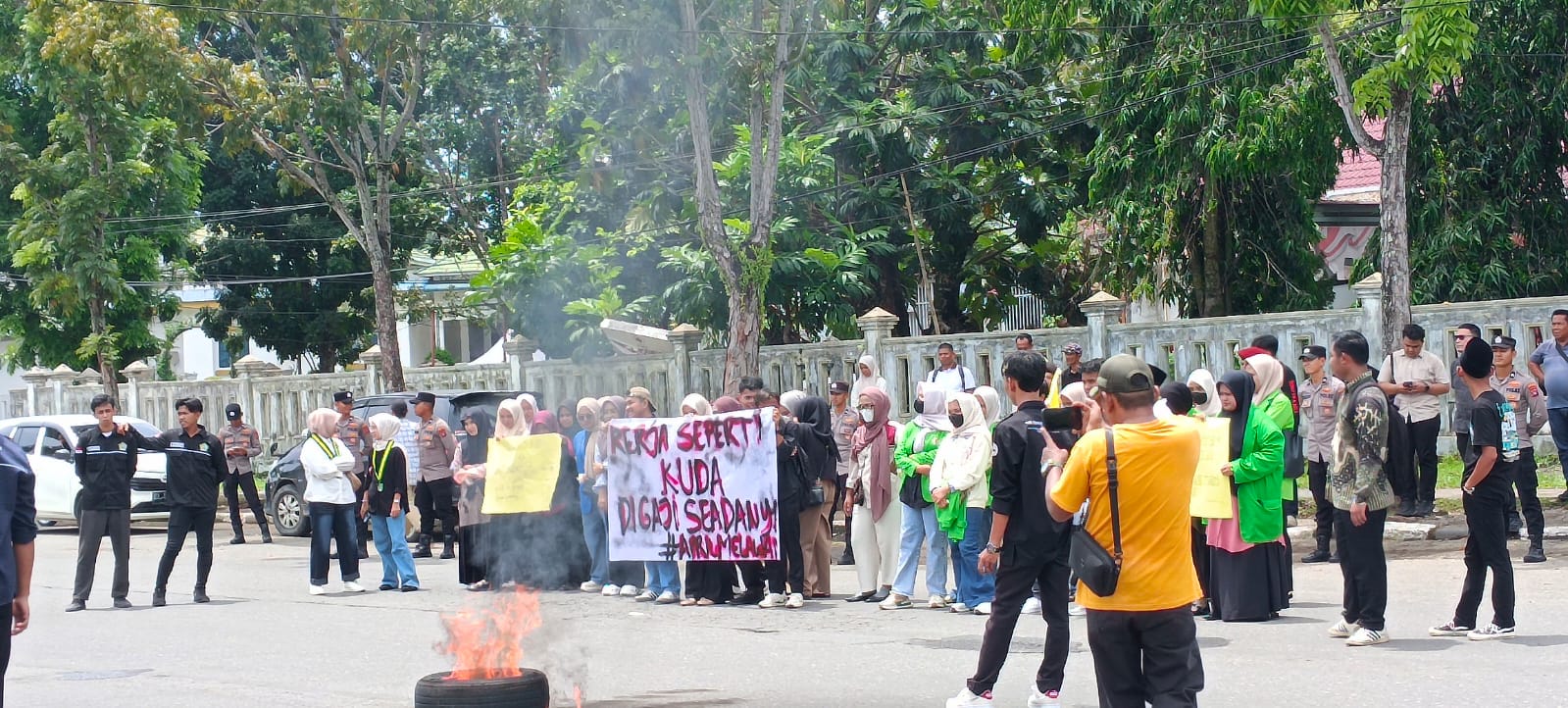Pantauan di lokasi, aksi berlangsung dengan pengawalan ketat dari aparat kepolisian dan Satpol PP. Meski diwarnai orasi keras, situasi tetap berjalan aman dan terkendali.