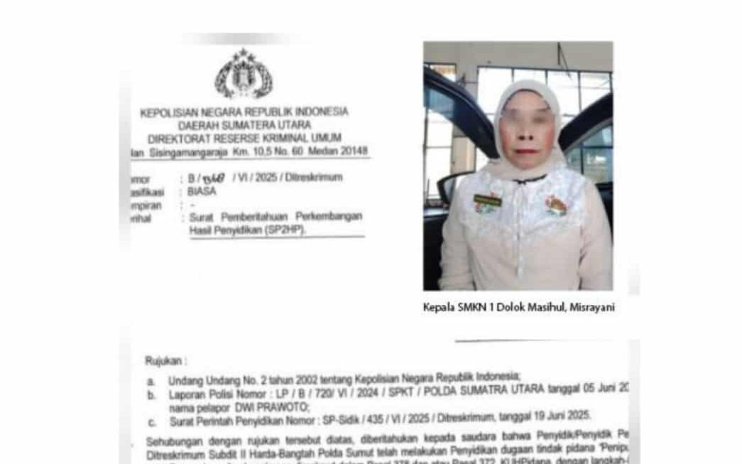 Medan | Mikanews : Proses kasus tindak pidana penipuan dan penggelapan yang melibatkan Kepala SMKN 1 Dolok Masihul, Misrayani SPd MSi, masih tergantung di Polda Sumatera Utara, Kamis (13/11/2025).