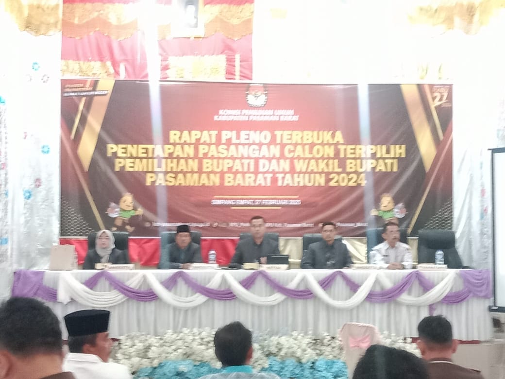 Ketetapan itu diumumkan saat berlangsungnya Rapat pleno terbuka penetapan pasangan calon (Paslon) terpilih pemilihan bupati dan wakil bupati Kabupaten Pasbar tahun 2024 di Aula Kantor KPU Pasbar, Simpang Empat pada Kamis (27/02/2025) pukul 16.00 wib.