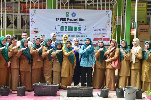 Pekanbaru | Mikanews : Suasana penuh semangat kebersamaan terlihat di SMAN 9 Pekanbaru saat Ketua TP PKK Provinsi Riau, Henny Sasmita Wahid, memimpin Gerakan Menanam di Sekolah (GEMAS), Selasa (30/9/2025).