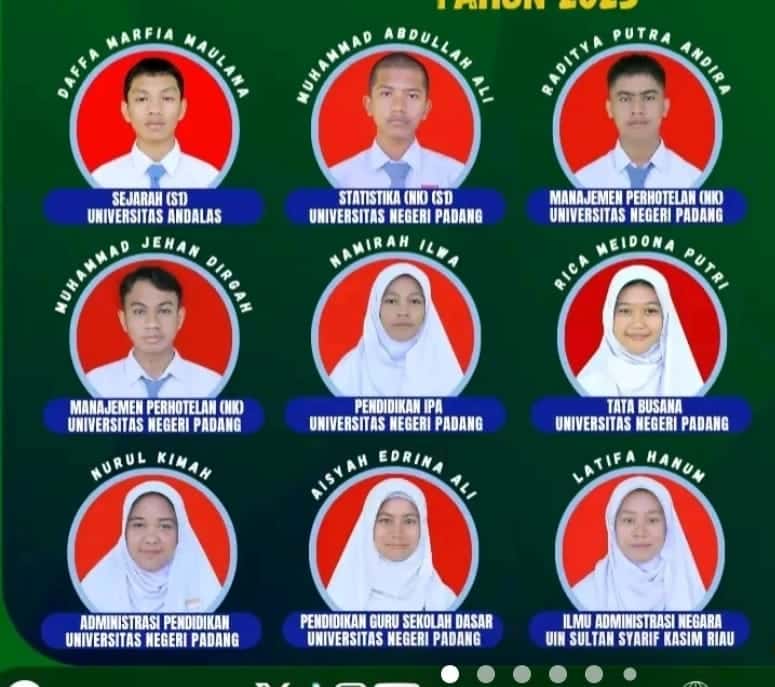 Sembilan siswa MAN 5 iyu, jelas Yelliza Gusti, adalah, Satu. Daffa Mafia Maulana, untuk program studi ilmu sejarah di Universitas Andalas Padang, Dua. Muhammad Jehan Dirgan, program studi manajemen perhotelan di Universitas Negeri Padang.