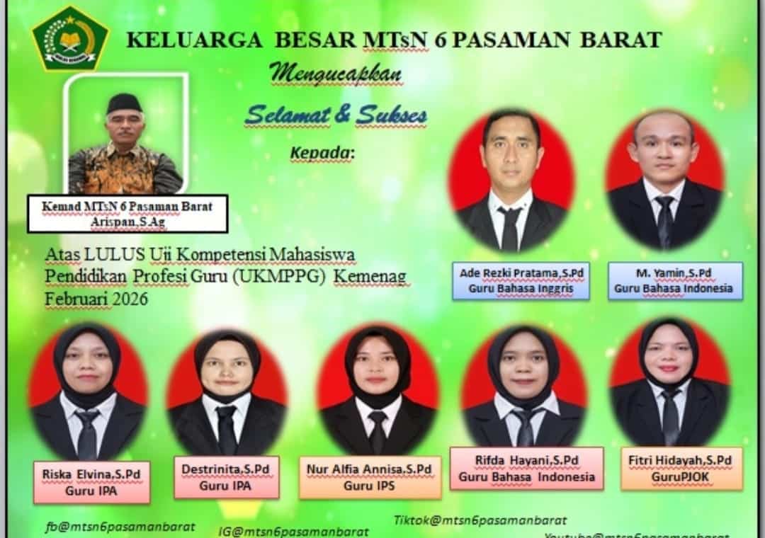 Pasaman Barat | Mikanews.id – Tujuh tenaga pendidik di MTsN 6 Pasaman Barat, Air Balam, Kecamatan Parit Koto Balingka, lulus Uji Kompetensi Mahasiswa Pendidikan Profesi Guru (UKM PPG), Februari 2026.